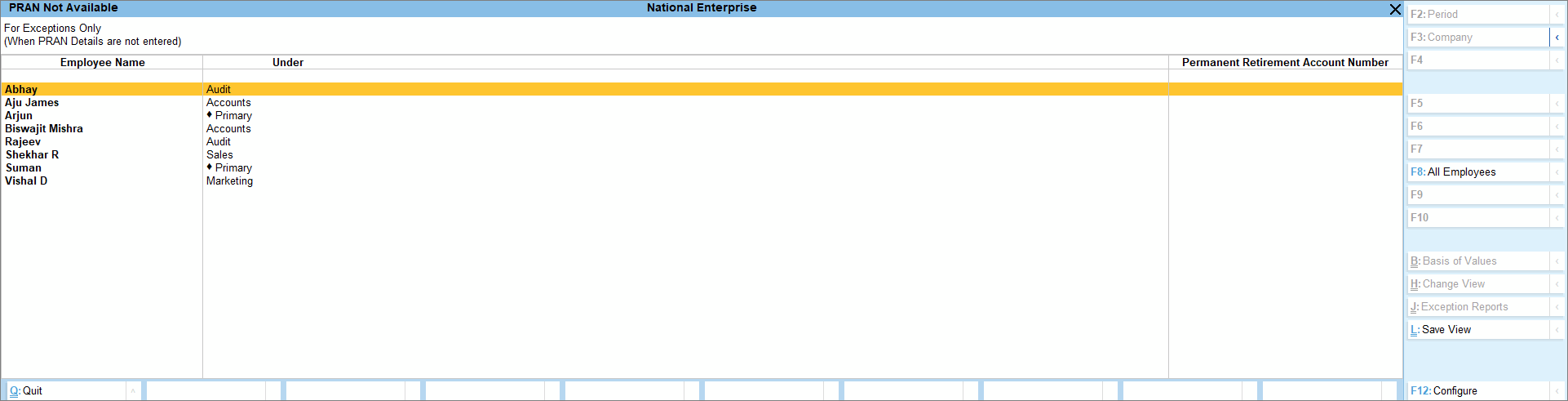View PRAN Not Available Report in TallyPrime (Payroll)