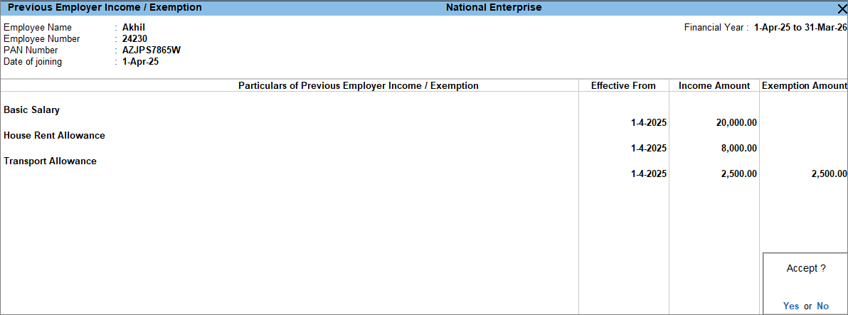 - Press Alt+G (Go To) > Alter Master > Previous Employer Income/Exemption Details and press Enter.