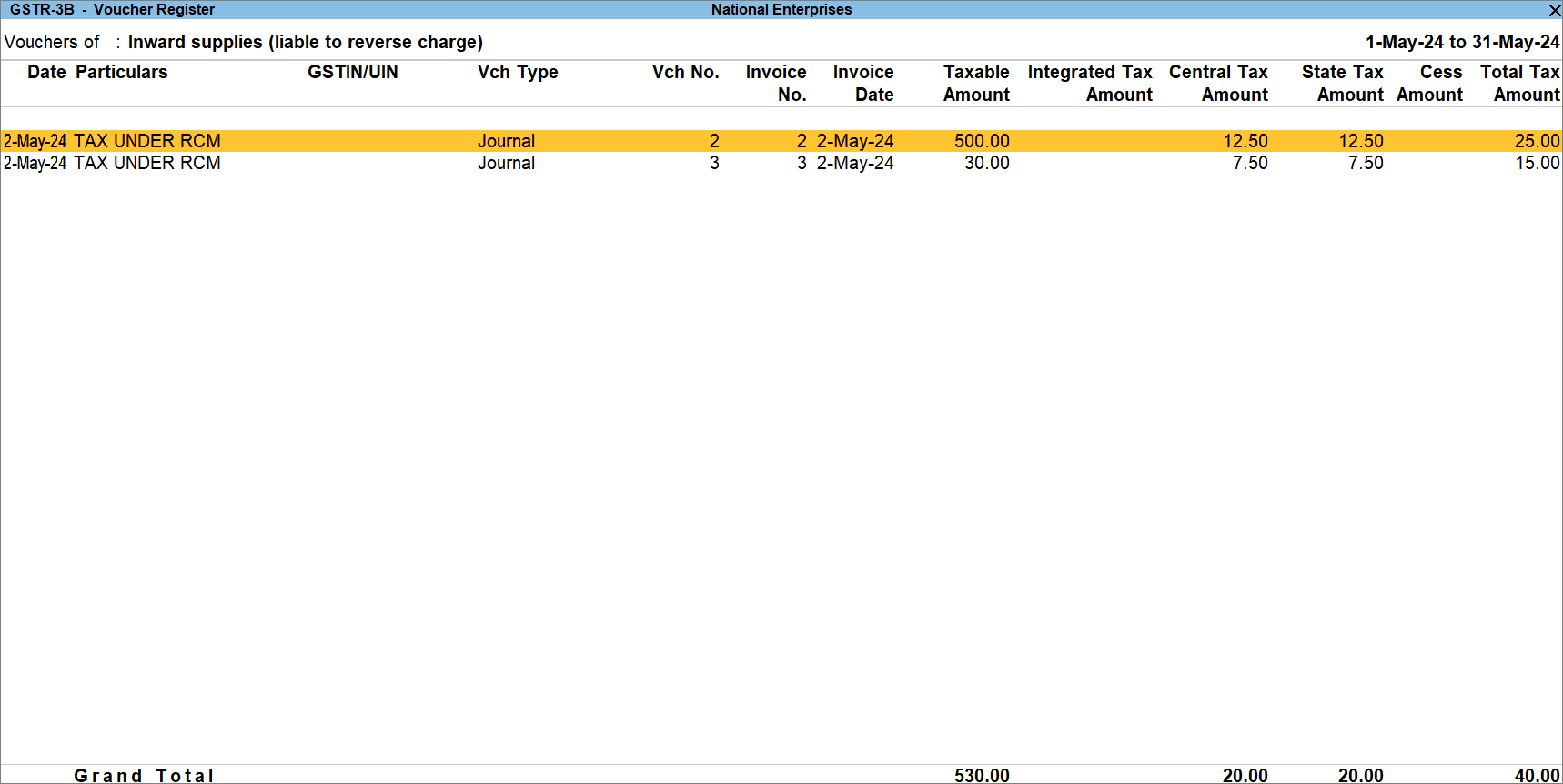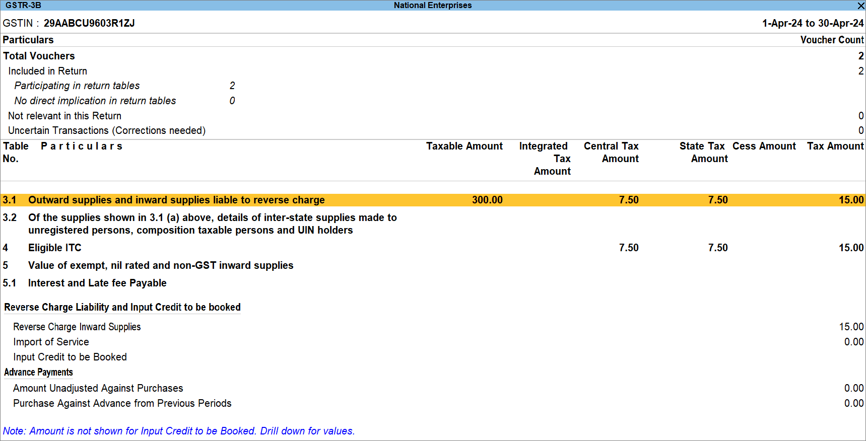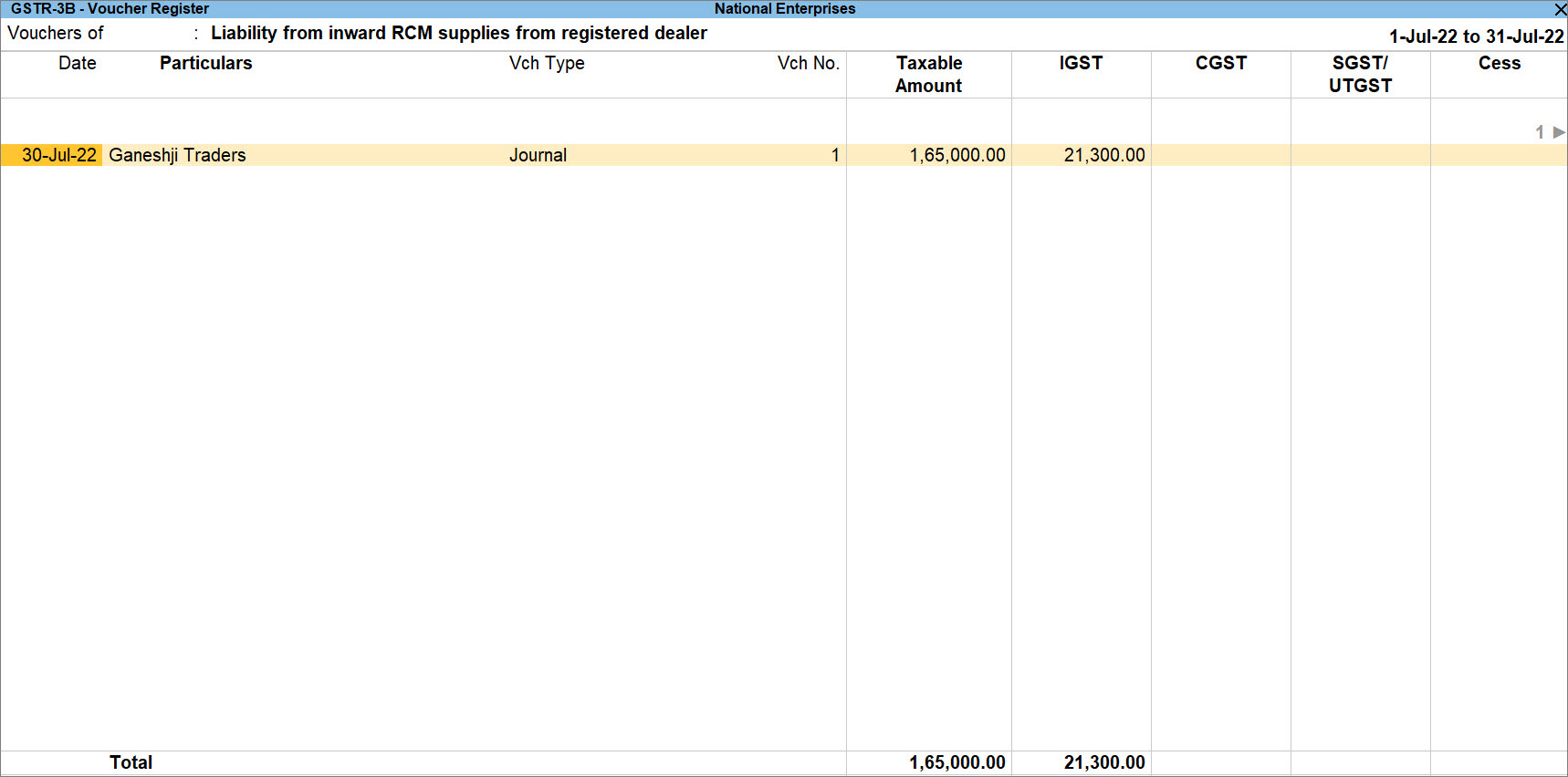 Once you record the journal voucher to raise the tax liability for the purchase of RCM goods in TallyPrime, the transaction gets included in the return and starts appearing in GSTR-3B as Liability from inward RCM supplies from registered dealer.