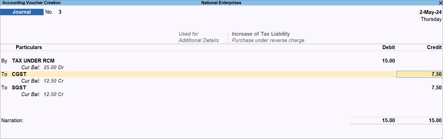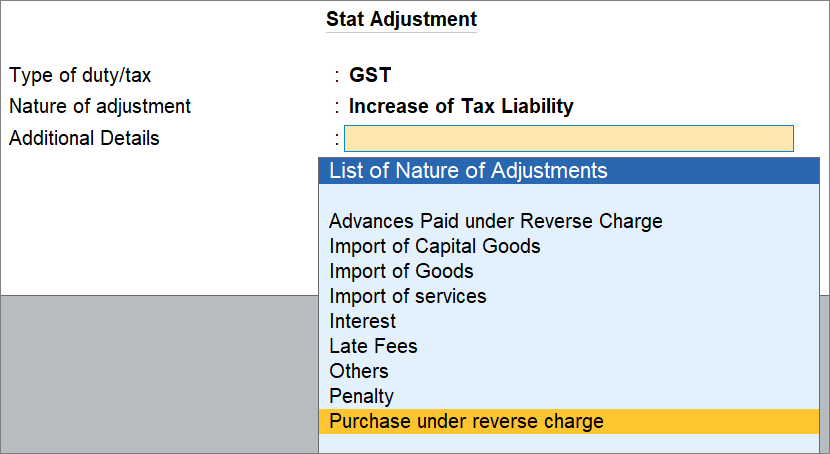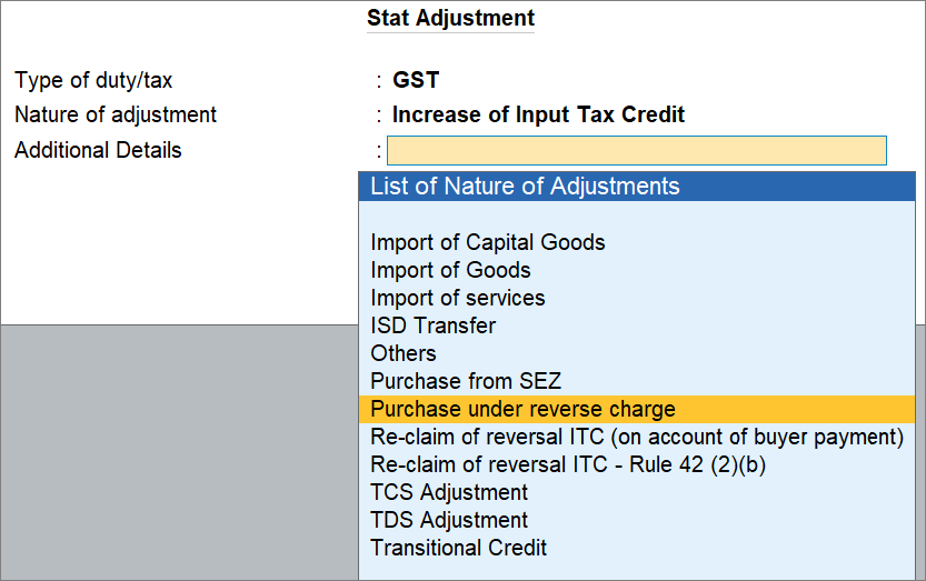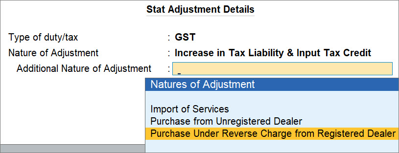 If you want to claim ITC in the subsequent month, then select Increase in Tax Liability. Thereafter, you will need to create a journal voucher in the subsequent month with Nature of Adjustment as Increase in Input Tax Credit. - Additional Nature of Adjustment: Purchase Under Reverse Charge from Registered Dealer.