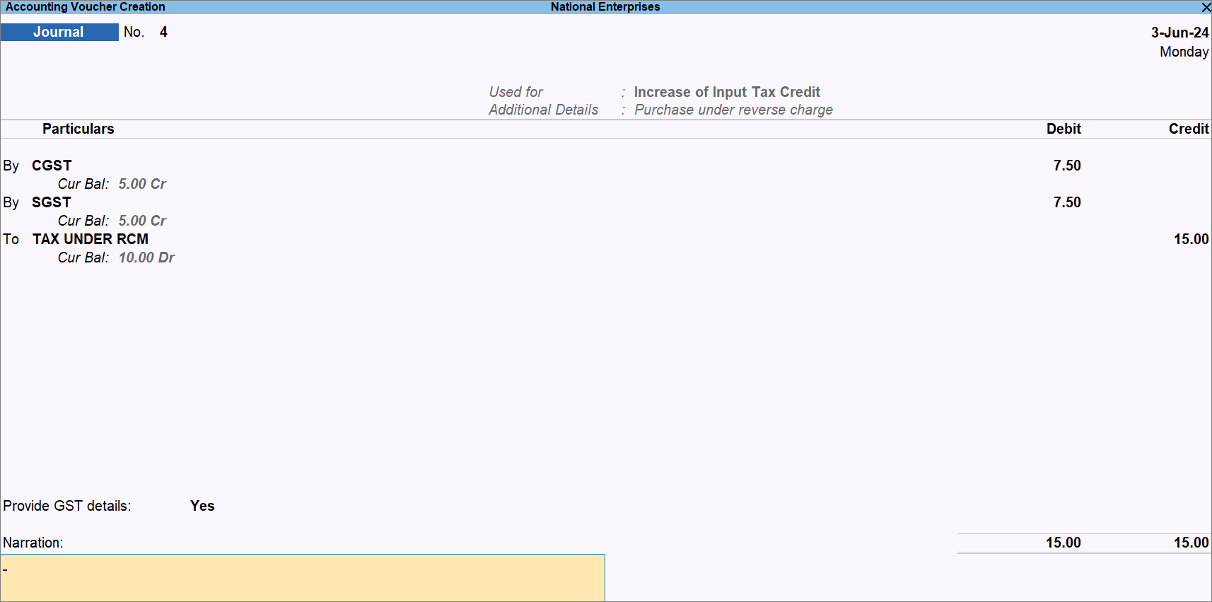 To know how to record GST payment to the department for RCM purchases, refer to the GST Payment Entry in TallyPrime topic.