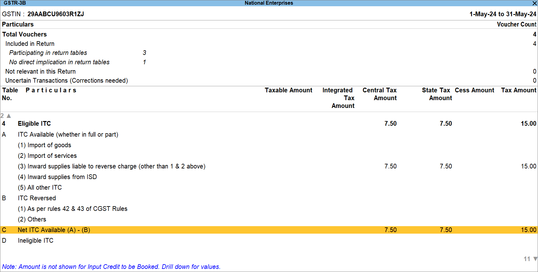 In GSTR-3B, you can view that the Net ITC Available (A) – (B):