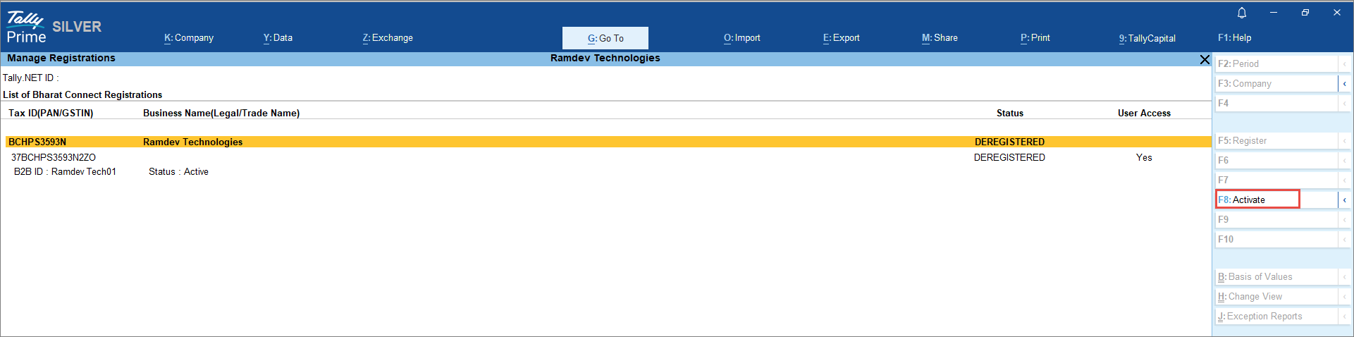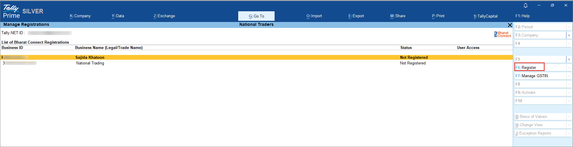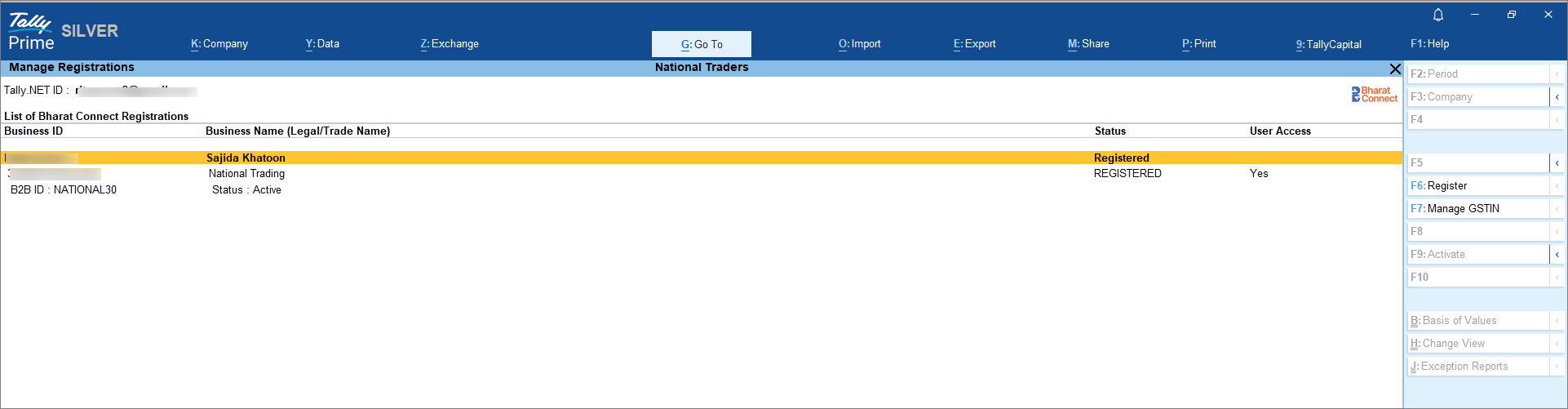- Press Alt+Z (Exchange) > All Bharat Connect Options > Manage Registrations.