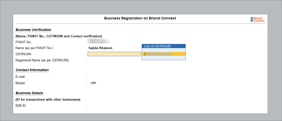 - In the Business Registration on Bharat Connect screen, select the GSTIN/UIN from the list.