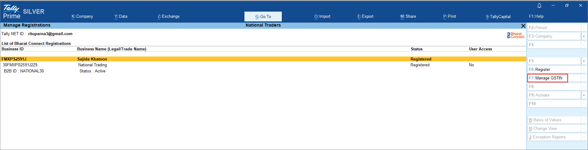 - Select the required GSTIN/UIN and press F7 (Manage GSTIN).