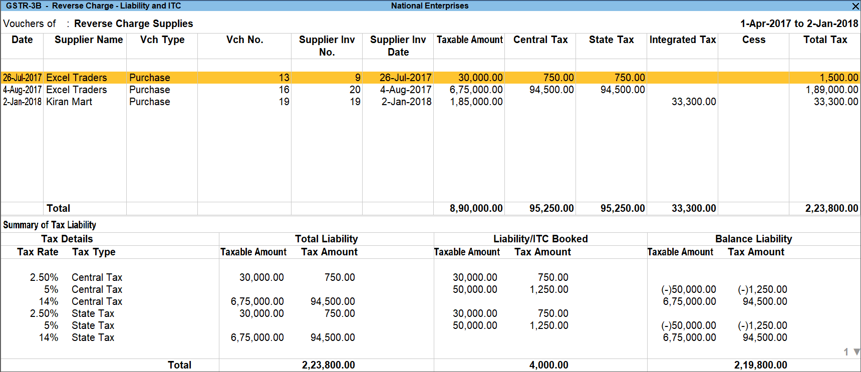 - To view Liability/ITC Booked, press Ctrl+H (Change View), select Liability/ITC Booked, and press Enter.