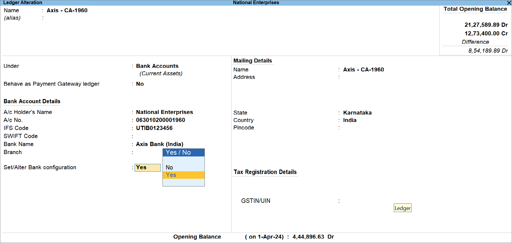 Press Alt+G (Go To) > Alter Master > Ledger > select the Bank Ledger and press Enter.