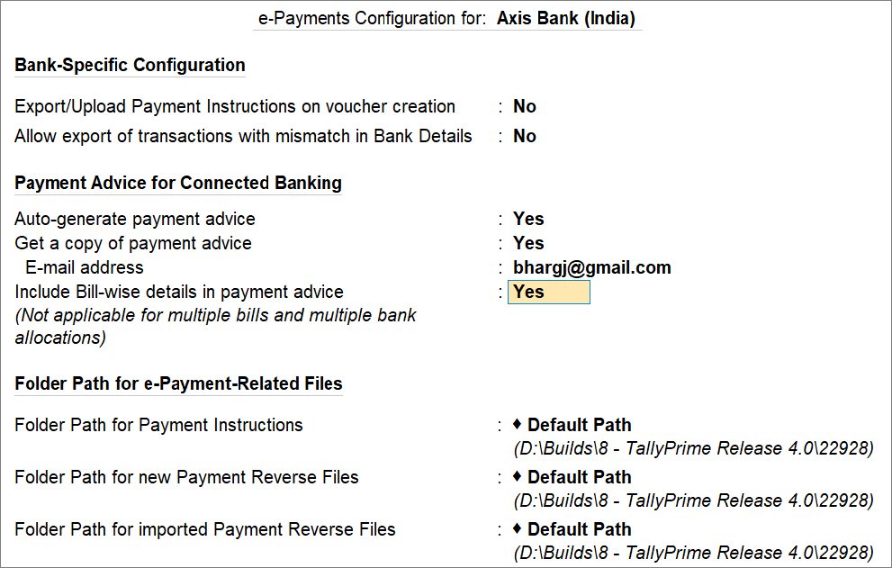 Once you send payments online using Connected Banking, you can also send payment advice to notify your suppliers and yourself as well upon successful completion of the payment in TallyPrime.