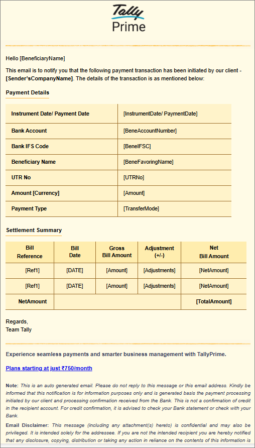 Sending payment advice does not mean a successful deposit of money in the recipient’s bank account. It is a notification to your recipients that the payment is completed in TallyPrime.