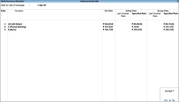 4. Note: For currencies that have been used in transactions, the Last Voucher Rate appears for reference.