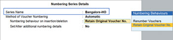 - Numbering behaviour on insertion/deletion: Applicable, only if you have selected Automatic or Multi-user Auto numbering method. Select to either retain the original voucher numbers or renumber the vouchers, as per your requirement.