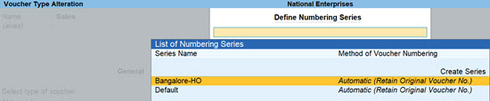 - Select the numbering series and provide the Voucher Numbering method details for that series.