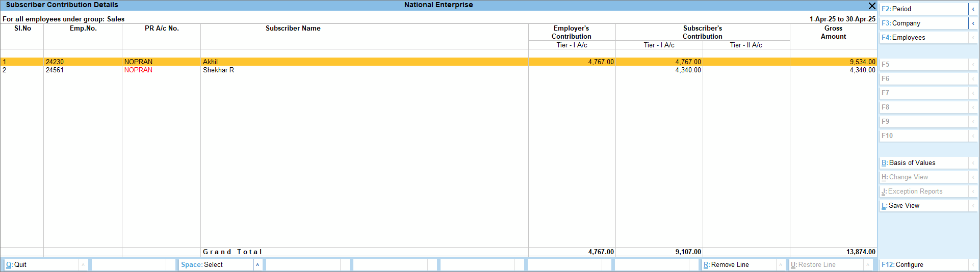 - To exclude employees with no PRAN from the report, then press Ctrl+B (Basis of Values) and disable Include Employees with no PR Account Number.