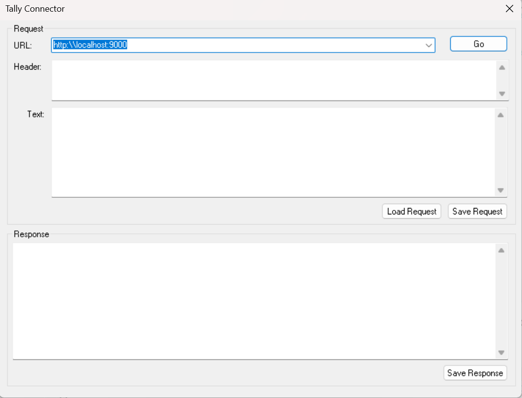 - URL – Enter the URL of TallyPrime or any other application which processes the request here. For example , if the XML request is sent to TallyPrime on the port 9000 on the local system, the URL “http://localhost:9000” is specified. Click on the GO button. In the response box you will be able to see if the server is running or not.
