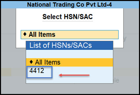 - Details under a specific HSN/SAC: Press F6 (HSN/SAC) > select the required HSN/SAC > press Enter.