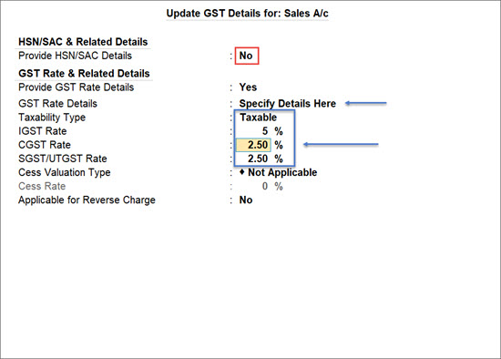 Setting this option to No will keep the HSN/SAC details intact as you had set previously. - Select Specify Details Here to enter the respective tax rates.