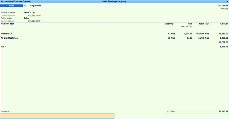 The HSN code appears in parenthesis, next to the stock item, instead of being displayed in a separate column. - Save the voucher by pressing Ctrl+A.