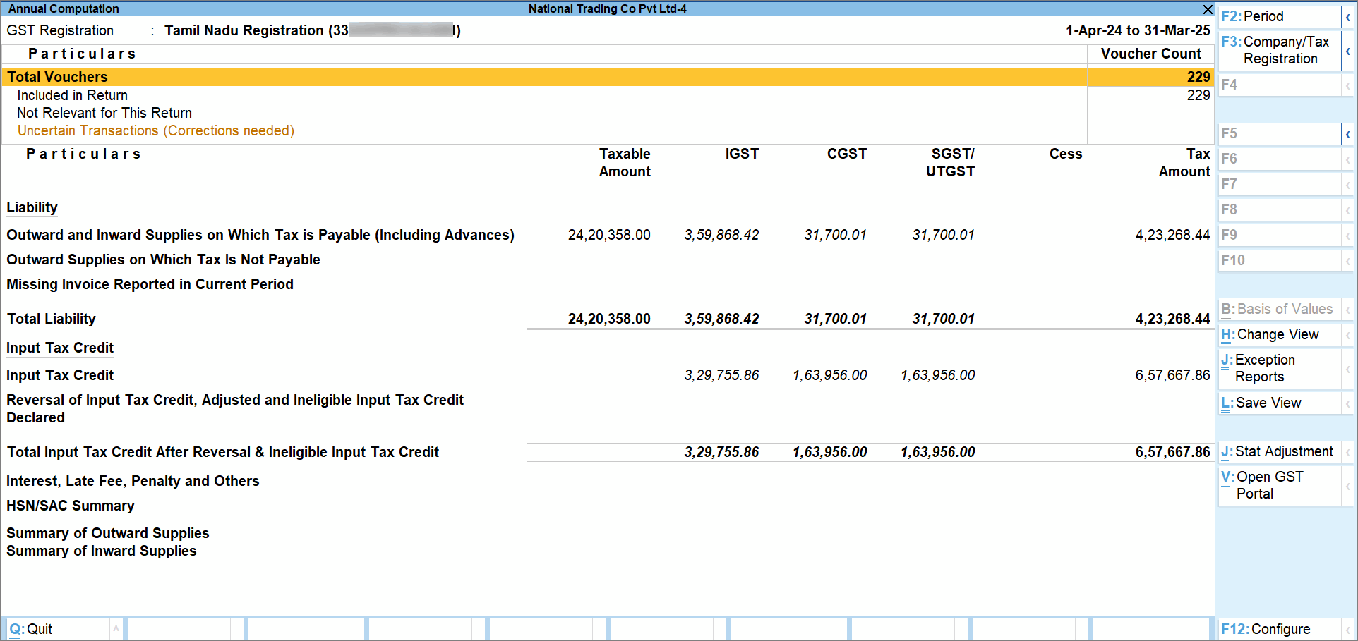 The GST Annual Computation report in TallyPrime provides a consolidated view of GST transactions recorded in your books for the financial year. The report groups these transactions into sections to help you review GST liability, input tax credit, and other values relevant for annual return filing. You can use this report to compare the values in your books with those reported in periodic GST returns such as GSTR-1, GSTR-2, and GSTR-3B.