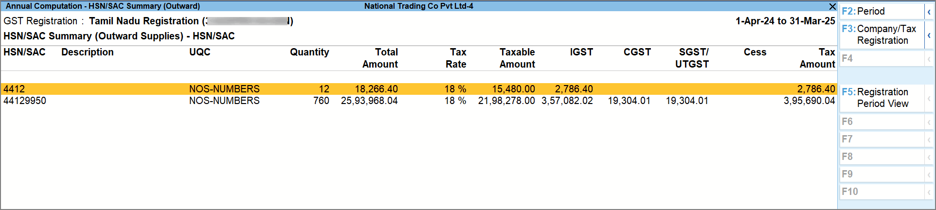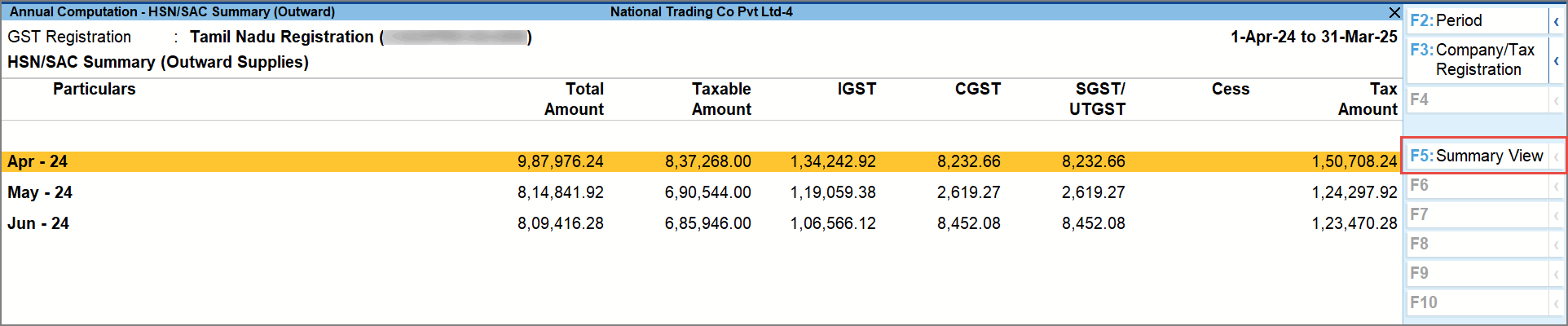 From TallyPrime Release 5.1, you can view HSN/SAC Summary of Outward Supplies in the GST Annual Computation for the whole year or for a particular period from F5 (Summary View). You can also view the monthly breakup of the summary and drill down from each month. Additionally, you can export the HSN/SAC Summary for the year in one Excel sheet.