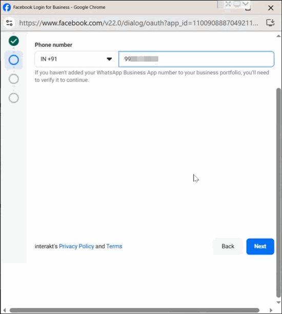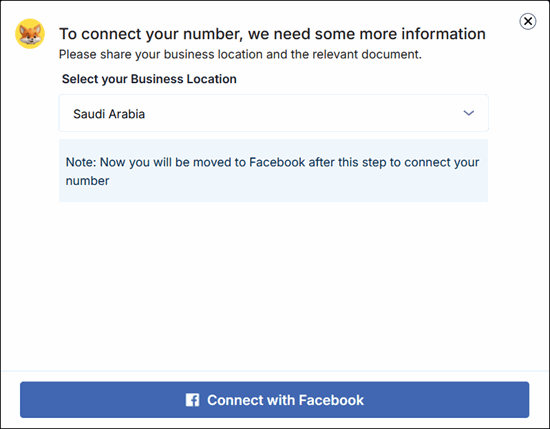 If your business location is outside India, you will see the option to connect your number using Facebook account.