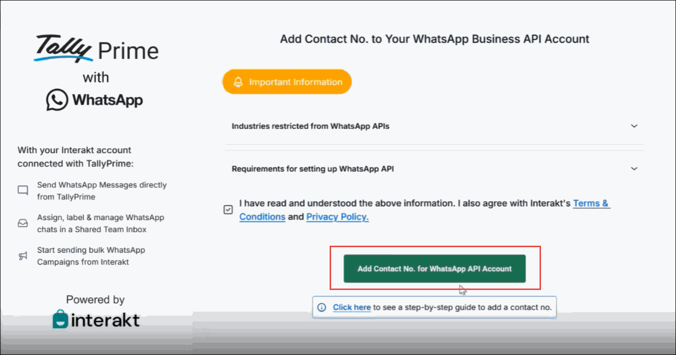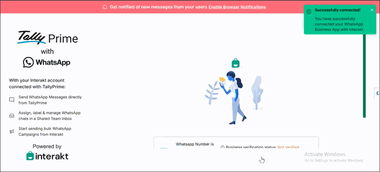 WhatsApp Trial: Before adding your contact number with WABA, you will also have the option to experience TallyPrime with WhatsApp using a Trial WhatsApp number assigned to you on Interakt. The trial number will be valid for 5 days from the date when your Interakt account is created. You can proceed with adding your contact number with WABA anytime during the trial period.