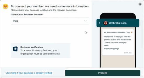 After the initial onboarding, the business verification process starts automatically with Meta. However, you can proceed to do the following steps, if your Business verification is rejected or in Not Verified status.