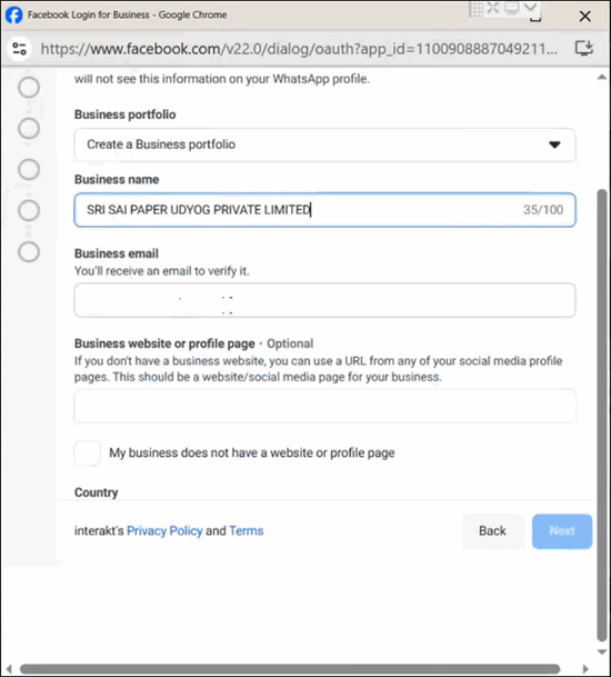 You can register with WABA through your company’s Facebook page and Meta Business Account. If you do not already have a Meta Business Account, you can create it during the sign-up process through the Interakt portal.