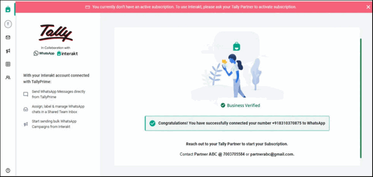 To begin with, contact your Tally Partner to discuss about this feature in details. Raise a request from your Customer Portal to initiate the sign-up process. Your Tally Partner will receive the request and get your Interakt account created. With the help of your Partner, you can then add your contact number to register with WhatsApp Business Account (WABA). Up on successful registration, your Partner will activate your WhatsApp subscription.