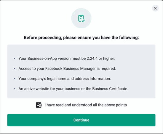 We recommend using a new contact number which is not already in use with any WhatsApp Personal/Business Apps. - A Facebook account: To log in and proceed for creating/updating WABA.