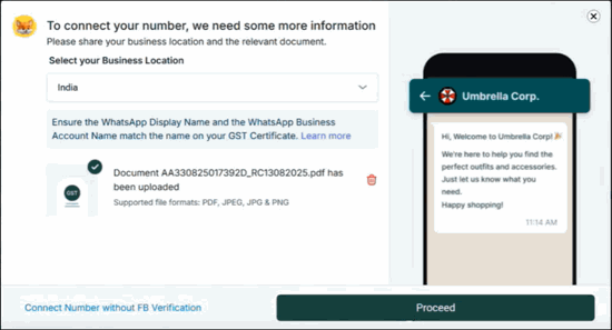 We highly recommend uploading your GST certificate for a hassle-free approval by Meta. However, if you do not have one, click Continue Without GST Certificate, and move to step 4 directly.