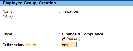 If you want to place an employee group under another group, you can create it on the fly. For example, you can create Accounts, Taxation, and Audit under Finance & Compliance. - Define salary details: Enable this option to enter the salary details of an employee group.
