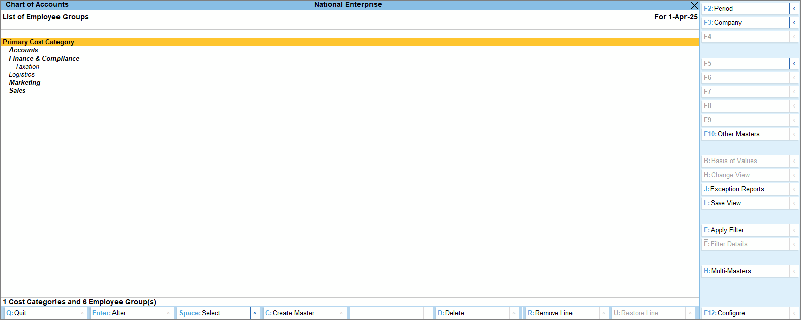 - Press Alt+G (Go To) > type or select Chart of Accounts > Employee Groups and press Enter.