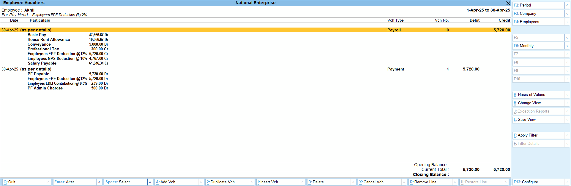 - Press Enter on the required Pay Head Type, then select the Pay Head and choose the employee name.