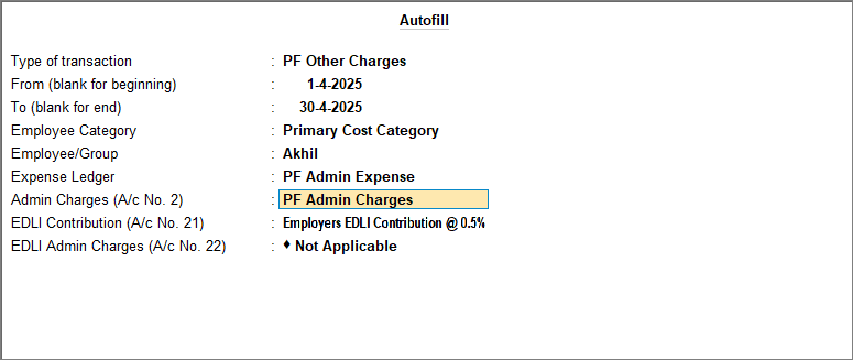 - Expense Ledger: Select the ledger you have created to record PF Admin expenses.