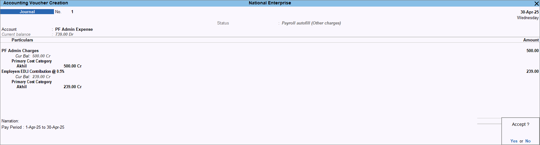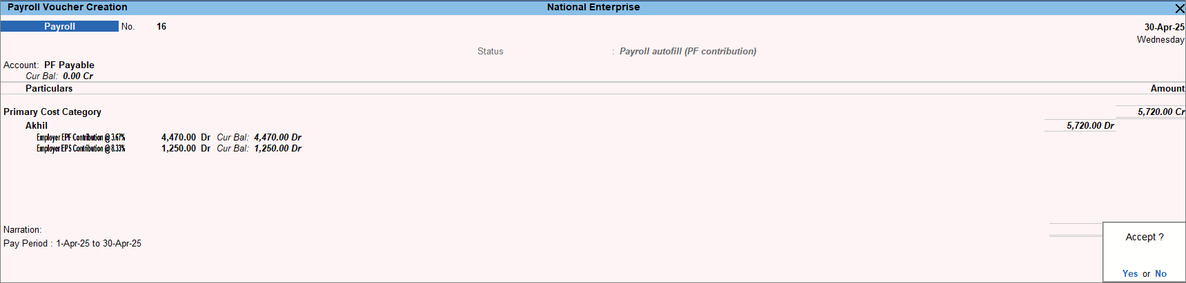 - Press Ctrl+A to save the voucher.