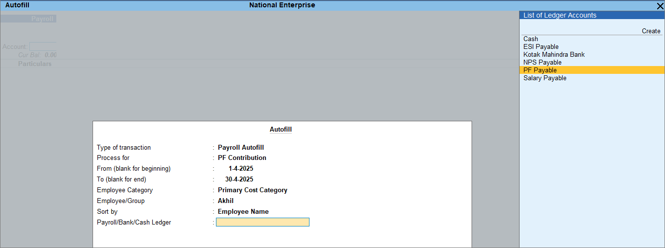- Payroll/Bank/Cash Ledger: Select the required payable ledger from the List of Ledger Accounts.