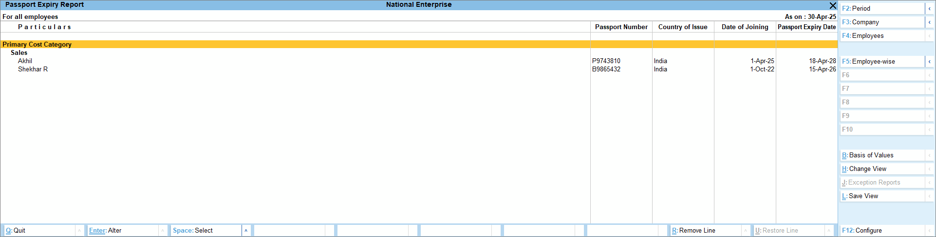 - Press F5 (Employee-wise) to view the Passport Expiry details individually for Employees or toggle to view the report based on the Category.