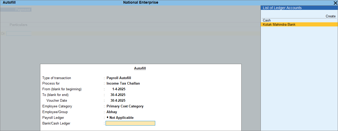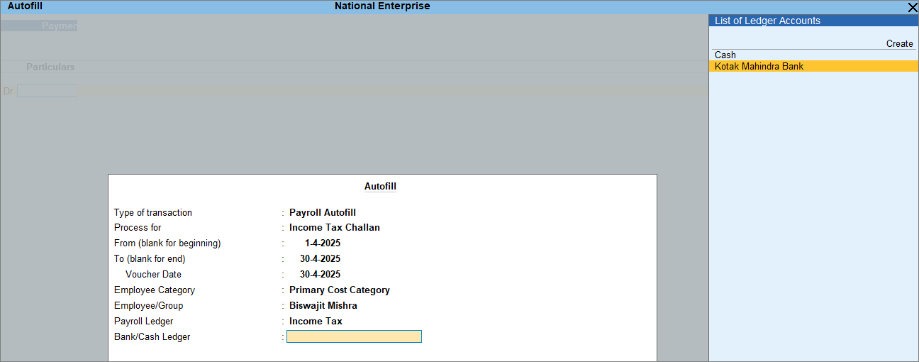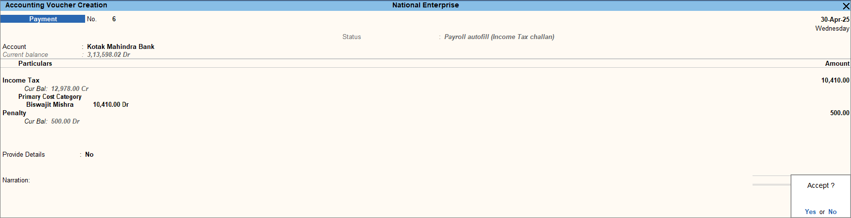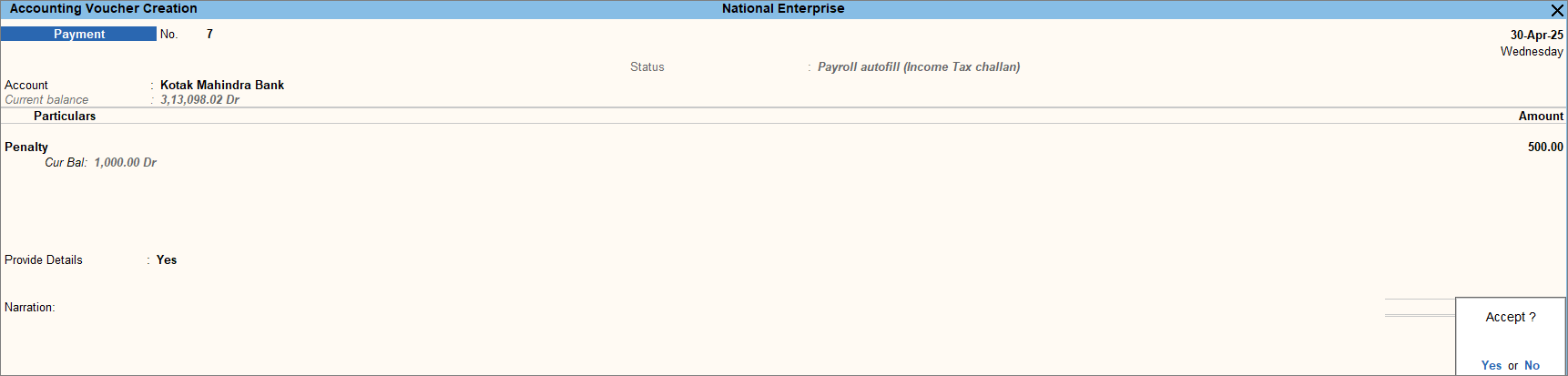 - In the Voucher Creation screen, select Penalty from the List of Ledger Accounts.