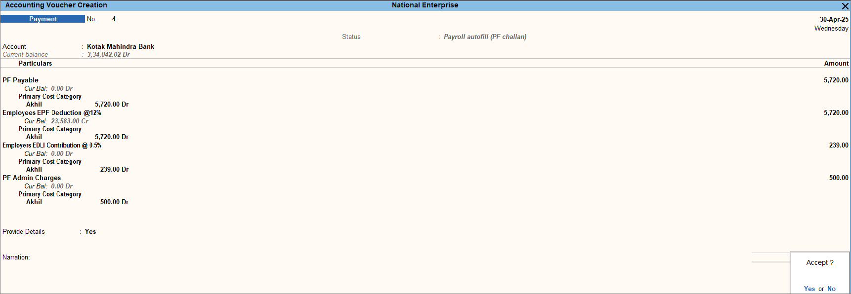 - Press Ctrl+A to save the voucher.