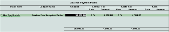 ● If the stock item being purchased from unregistered dealer does not attract reverse charge, do not configure the stock item for reverse charge. Select the ledger configured for reverse charge in the Advance Payment Details screen.