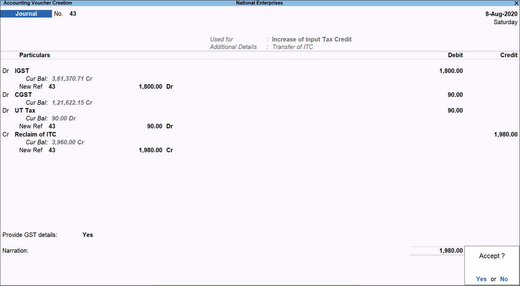 On the voucher, debit the Integrated Tax, Central Tax, and UT Tax ledgers and credit the Reclaim of ITC ledger created under Current Assets or Income.