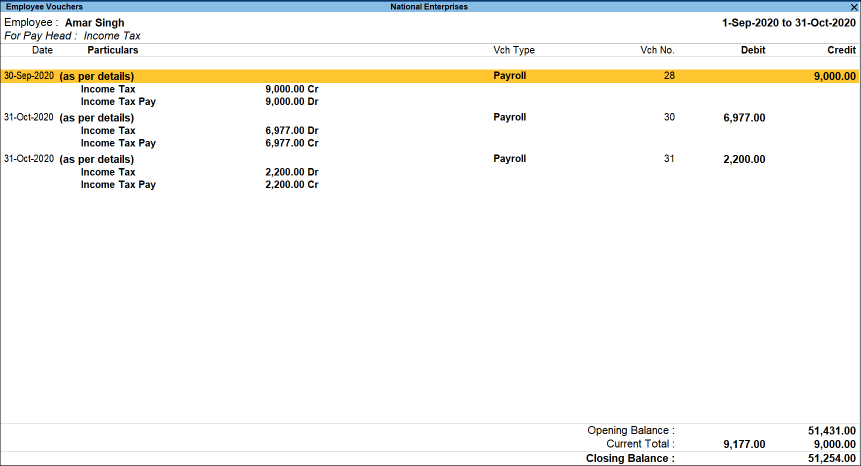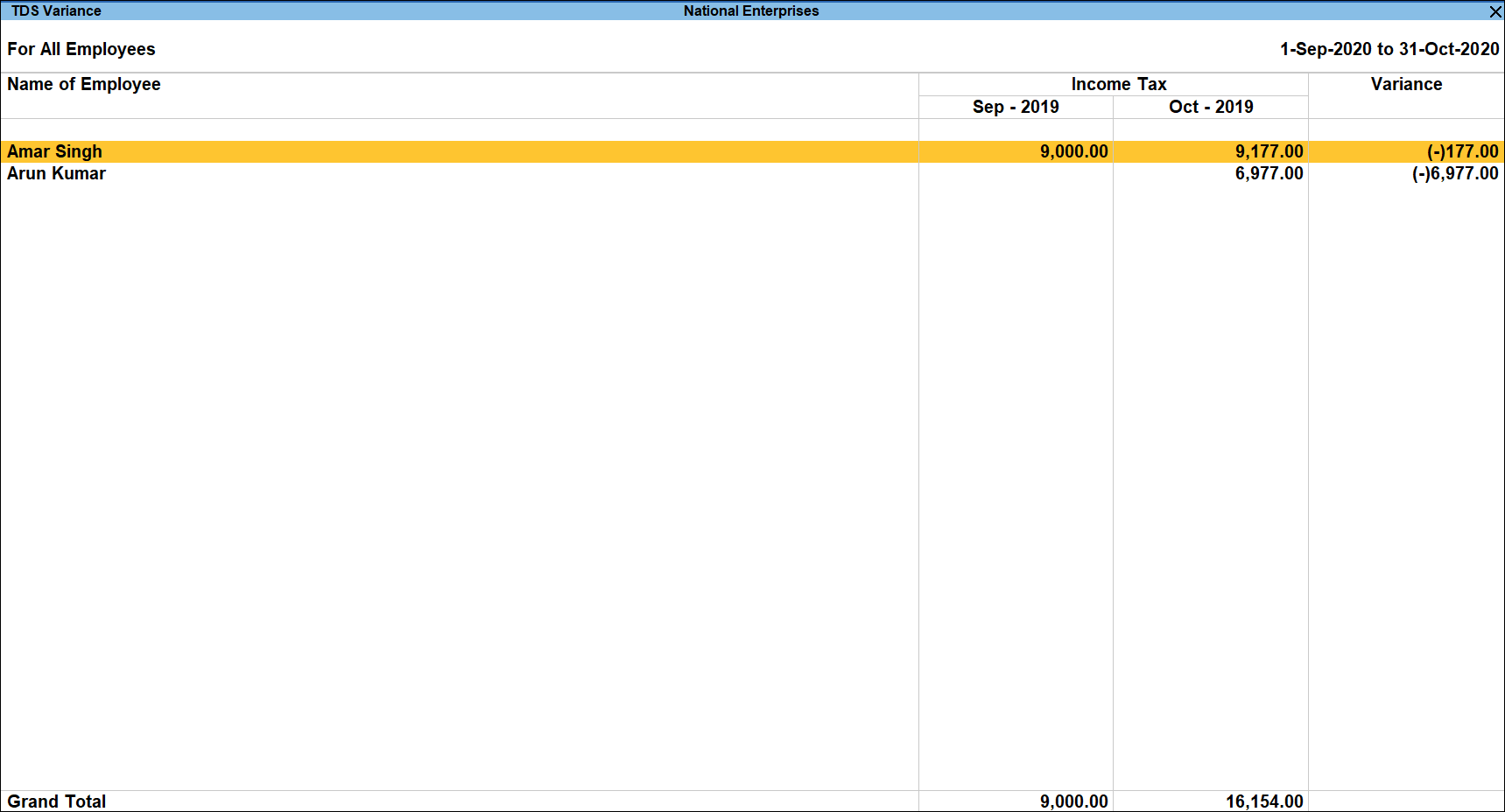 - Press Enter on the required month to view the Employee wise Tax details along with Variance.