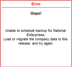 Cause: This error appears when the company is not compatible with the current release of TallyPrime and therefore cannot be scheduled for backup.